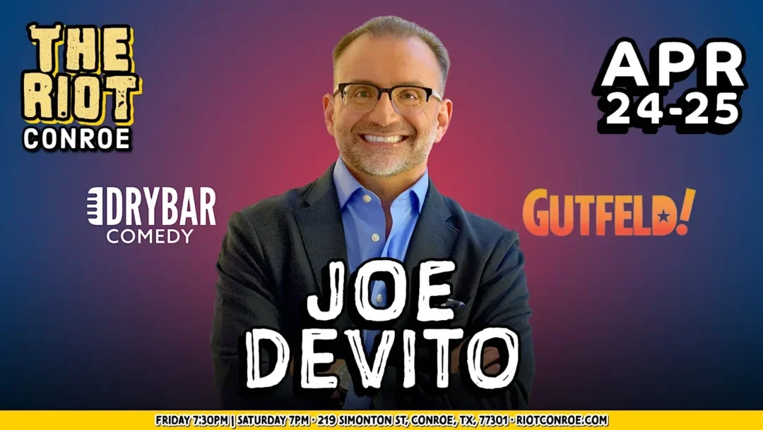 Don’t miss your chance to catch live standup in Conroe at the city’s best comedy hotspot, The Riot! Don’t miss your chance to catch live standup in Downtown Conroe at the city’s newest comedy hotspot. This weekend, we welcome comedian Joe DeVito, whose credits include Gutfeld! and Dry Bar Comedy. Come on out and join us for a night of live comedy from a seasoned performer with years of experience in clubs, theaters, and TV screens across the country.